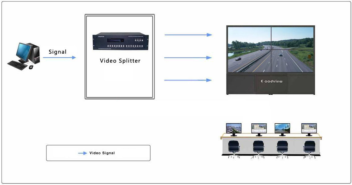 Display one whole content on the lcd video wall units for single input signal by simply using video splitter.